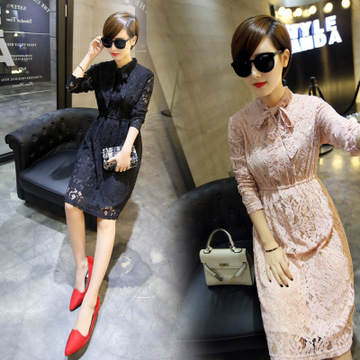 一件代發(fā) 2016春夏新款 韓版蕾絲蝴蝶結(jié)領(lǐng)結(jié)收腰高腰中長(zhǎng)款連衣裙 /