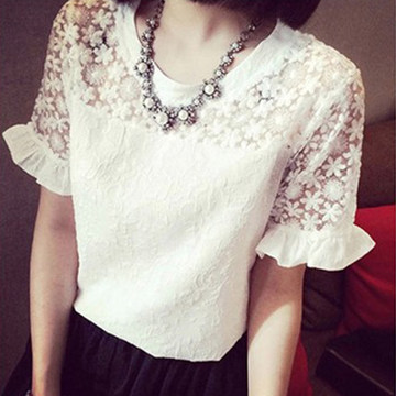 2016蝴蝶結(jié)夏季甜美鏤空荷葉邊短袖蕾絲衫女裝白色雪紡短袖上 /
