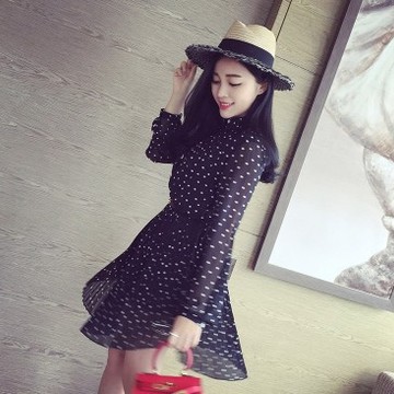 2016春季新款歐美復(fù)古波點(diǎn)不規(guī)則下擺飄逸雪紡連衣裙 /