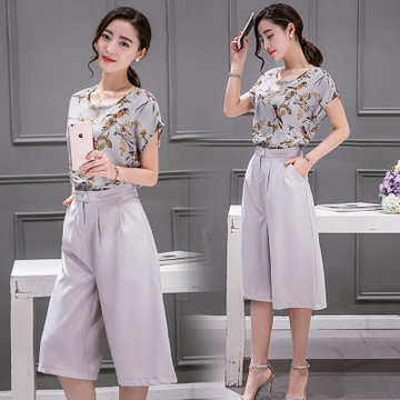 實拍2016夏季新款休閑時尚百搭印花上衣七分褲闊腿褲套裝女 /