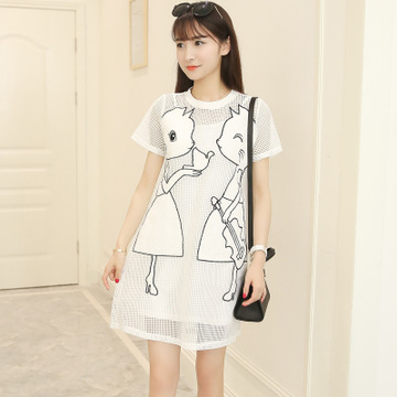實拍2016夏裝新品鏤空卡通刺繡歐根紗連衣裙吊帶兩件套連衣裙 /