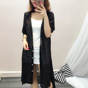 1503夏季新款大牌簡約百搭棉麻格子長款開衫潮女 /