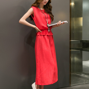 2016夏季新款韓版修身顯瘦假兩件棉麻連衣裙中長款氣質(zhì)背心長裙 /