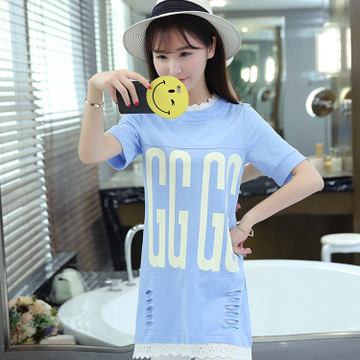 • 2016夏裝韓版女裝破洞字母圖案蕾絲花邊中長(zhǎng)款連衣裙 8260# /
