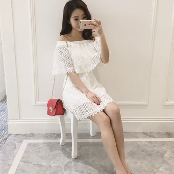 • 2016夏季新款韓版時(shí)尚蕾絲兩穿一字肩顯瘦鏤空連衣裙女 8258# /