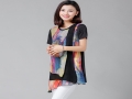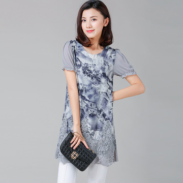 2016春夏大碼女裝中長款圓領(lǐng)花邊雪紡衫 /