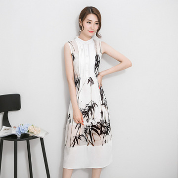 2016夏裝新款女復(fù)古氣質(zhì)無袖修身印花打底裙真絲連衣裙 /