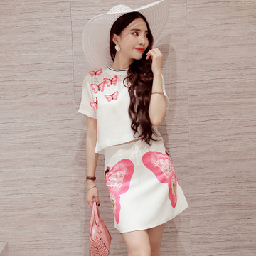 2016夏季新款女裝氣質(zhì)時(shí)尚蝴蝶刺繡拼接鏤空上衣印花半裙套裝裙潮 /