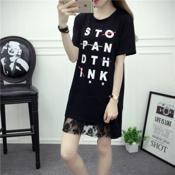 實(shí)拍新款韓版字母印花蕾絲拼接打底衫寬松中長款短袖t恤女夏 /