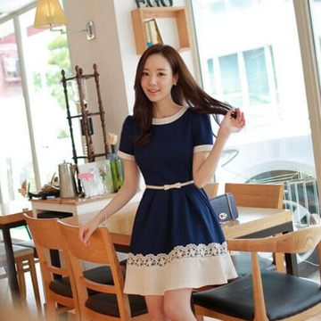 2016夏裝韓版新款女裝中長(zhǎng)款蕾絲短袖甜美鑲色花邊氣質(zhì)修身連衣裙 /