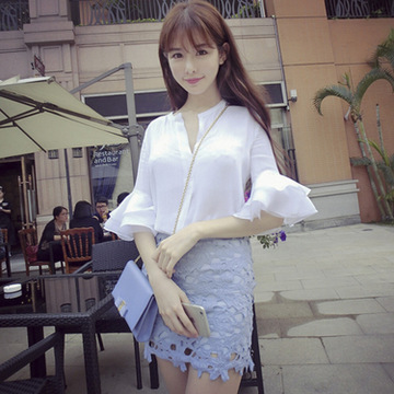 2016夏裝韓版喇叭袖V領雪紡上衣鏤空蕾絲半身裙兩件套女裝 /