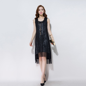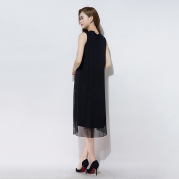 OL通勤滌綸連衣裙中長(zhǎng)款假兩件真絲鏤空波紋時(shí)尚大氣連衣裙 /
