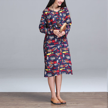 實拍2016春裝新款大碼女裝寬松長裙民族風(fēng)棉麻印花長袖連衣裙 /