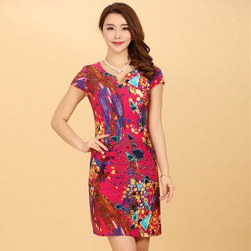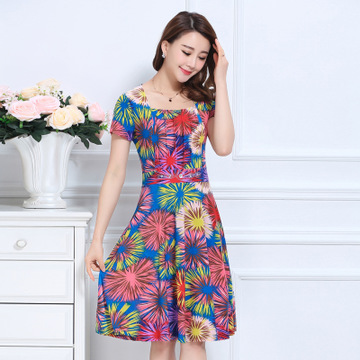 夏季大碼女裝短袖冰絲連衣裙韓版印花修身碎花彈力廣場(chǎng)舞沙灘裙 /
