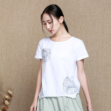 2016夏季新款亞麻女裝上衣文藝大碼寬松顯瘦印花棉麻T恤女打底衫 /