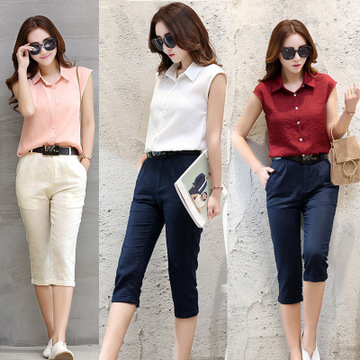 時尚套裝女 2016夏季氣質(zhì)亂麻短袖休閑兩件套修身顯瘦七分褲 /