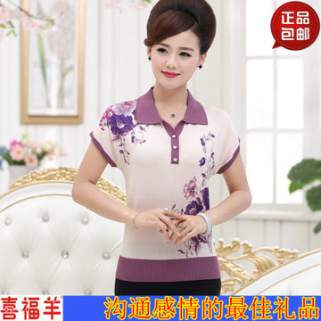 2016夏季媽媽裝碎花t恤衫桑蠶絲短袖T恤女中年寬松翻領(lǐng)女裝半開衫 /