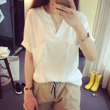 • 女裝寬松休閑口袋棉麻襯衫短袖V領套頭純色亞麻襯衣 /