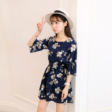 2016春季新款大碼女裝中長款寬松碎花大擺裙子氣質(zhì)蝙蝠袖連衣裙棉 /