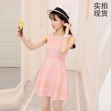 2016夏裝新款韓版大碼歐根紗雪紡蕾絲無袖連衣裙女修身顯瘦公主裙 /