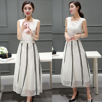 2016新款歐根紗兩件套連衣裙夏氣質(zhì)長裙女半身裙顯瘦雪紡套裝裙子 /