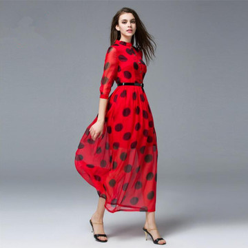 歐洲站2016春裝新款歐美時尚波點(diǎn)印花飄逸優(yōu)雅長款連衣裙 /