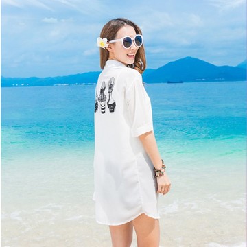 2016夏沙灘防曬衣女中長款雪紡素描頭像印花開衫外套薄 /
