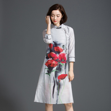 2016春季新品開叉復古盤扣改良版旗袍真絲印花連衣裙 /