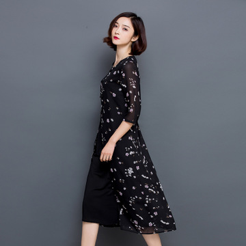 2016新款中長款裙假兩件套真絲顯瘦碎花連衣裙 /