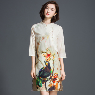 新款2016旗袍領優(yōu)雅氣質(zhì)寬松中長裙桑蠶真絲印花連衣裙 /