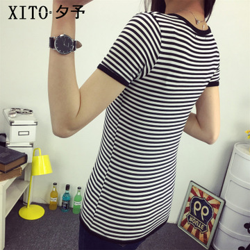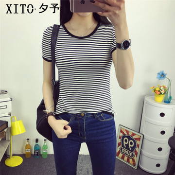 條紋圓領(lǐng)打底衫女2016新品修身純棉韓版短袖女士t恤DT34 /
