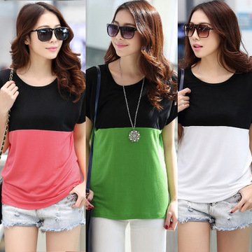 夏季新款寬松大碼女裝百搭圓領韓版莫代爾短袖t恤女 撞色T恤批發(fā) /