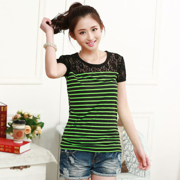 2016夏季新款韓版條紋女士T恤 修身純棉條紋拼接短袖打底衫 批發(fā) /