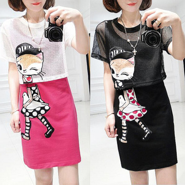 2016韓版夏裝新款女裝貓咪短袖網(wǎng)紗罩衫兩件套裝修身卡通連衣裙潮 /