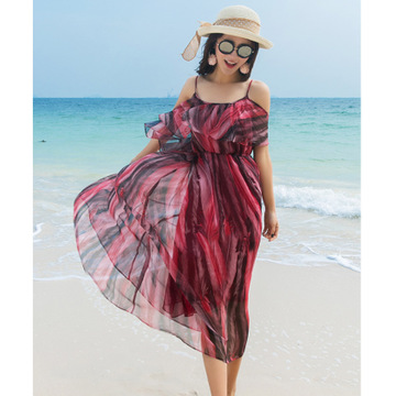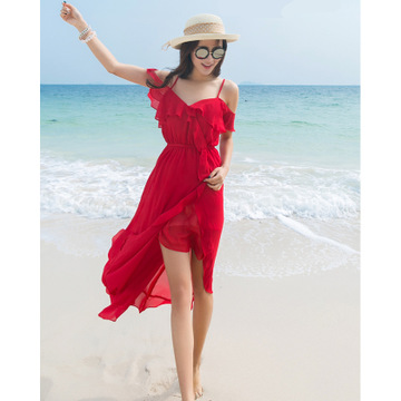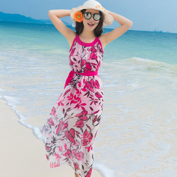 2016夏季新款吊帶露肩雪紡荷葉邊波西米亞沙灘裙海邊度假長裙 /
