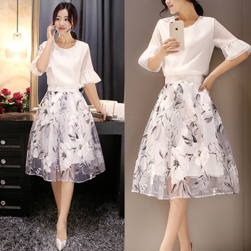 夏裝新款2016韓版女裝歐根紗套裝裙 雪紡短袖中長款兩件套連衣裙 /