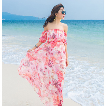 夏季新款露肩沙灘裙印花海邊度假仙女修身顯瘦一字領雪紡連衣裙 /