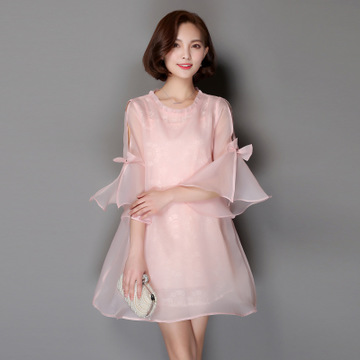 實拍2016年夏季歐根紗連衣裙蕾絲喇叭袖兩件套大碼女裝 /
