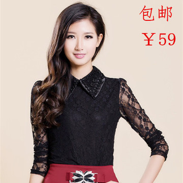 2016春裝新款韓版長袖上衣翻領(lǐng)訂珠修身大碼蕾絲打底衫女小衫批發(fā) /