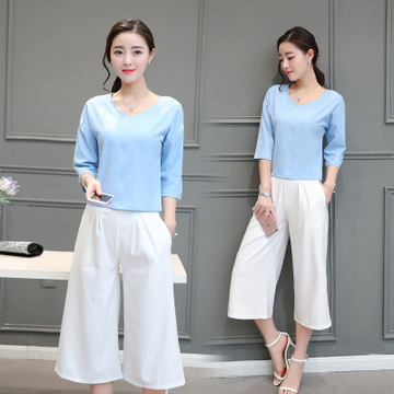 時尚小香風(fēng)V領(lǐng)七分袖上衣+七分闊腿褲套裝兩件套 /