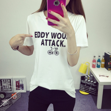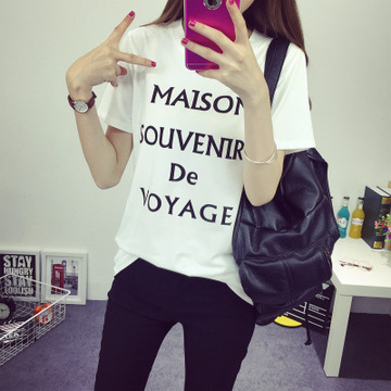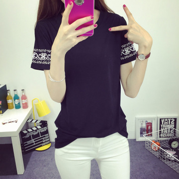 原宿風(fēng)夏季新款時尚寬松圓領(lǐng)原宿拼色袖子印花短袖T恤半袖女 /