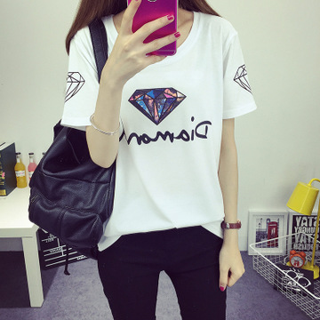 新款韓版簡約鉆石短袖T恤女學(xué)生顯瘦寬松打底衫休閑女T /