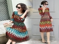 圓領(lǐng)雪紡印花連衣裙七分袖2016春夏裝新款女裝修身中長(zhǎng)裙子A字裙 /