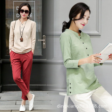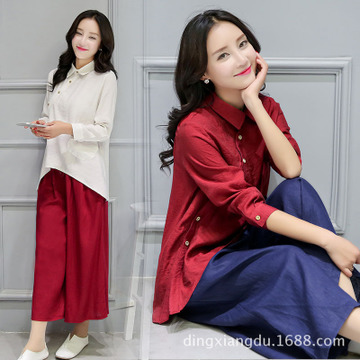 2016春裝新品女裝長(zhǎng)袖純色棉麻襯衫領(lǐng)文藝范時(shí)尚闊腿褲套裝兩件套 /