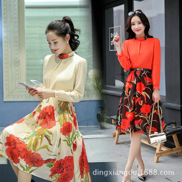 春裝新款女裝2016長(zhǎng)袖碎花雪紡連衣裙修身淑女印花中長(zhǎng)款打底裙 /
