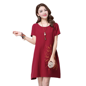2016春夏新款短袖韓版寬松顯瘦刺繡打底裙大碼棉麻連衣裙女中長款 /