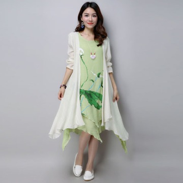 春裝新款女裝短袖印花套裝連衣裙寬松大碼棉麻兩件套a字裙 /