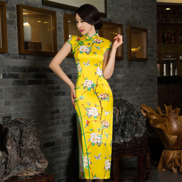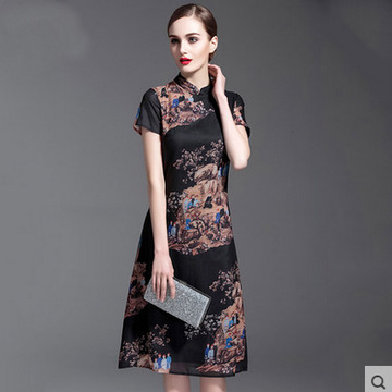2016夏新款雪紡連衣裙復(fù)古修身顯瘦旗袍裙氣質(zhì)印花中長裙 /