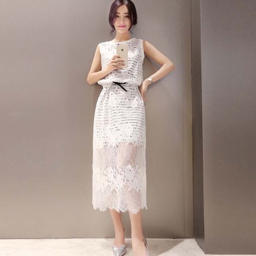 2016夏季新款韓版蕾絲條紋沙灘度假收腰系帶中長款白色背心裙 /