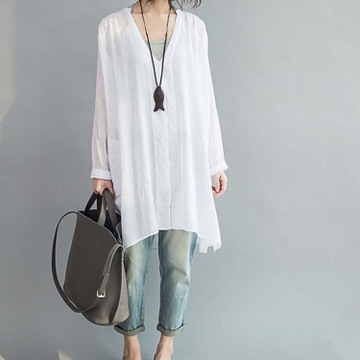 2016韓版新款大V領(lǐng)寬松中長款水洗薄棉襯衫清透防曬衣女 /